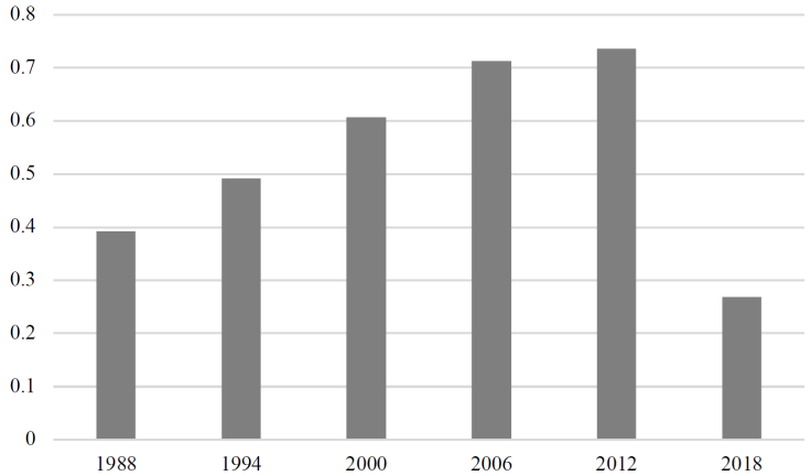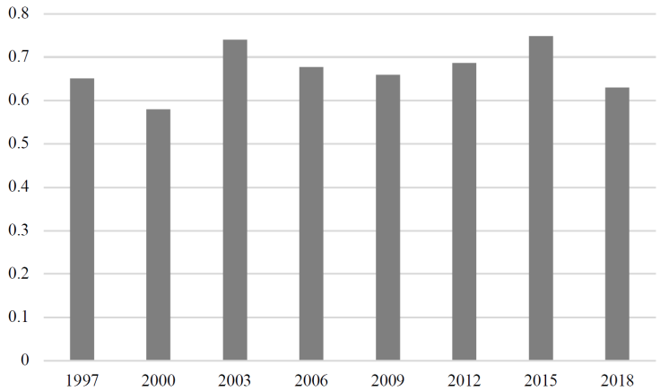 Para el caso del congreso, los índices de fragmentación parlamentaria son un poco más elevados que a nivel ejecutivo desde 1997 a 2018 (Gráfica 8). En promedio se mantuvo en 0.66. Esto refleja que existió un mayor número de partidos políticos compitiendo en el congreso que a nivel gubernatura.