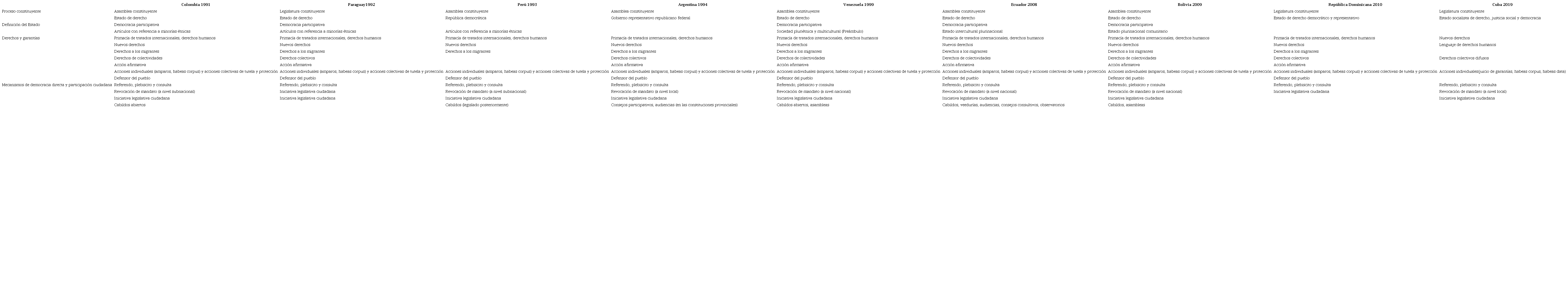 La mayoría de las constituciones analizadas aquí se originaron por asambleas constituyentes, siendo las de Colombia, Argentina y Bolivia las más plurales dado que contaron con representación de los diferentes partidos políticos. En Colombia, además de los partidos, se contó con representantes de comunidades indígenas y de la sociedad civil (estudiantes, cristianos no católicos) (Noguera y Criado, 2011), mientras que en Argentina se logró una nutrida representación de partidos y en Bolivia el legislativo convocó a una asamblea que contó con presencia de 10 fuerzas políticas. Menos plurales fueron las Asambleas Constituyentes de Perú, Venezuela y Ecuador, conformadas con predominio del partido dominante. En Venezuela, el presidente convocó -vía consulta vinculante- a una asamblea constituyente que finalmente quedó conformada por una abrumadora mayoría de delegados chavistas. Este proceso fue muy similar al de Ecuador, donde Correa, ya en la presidencia y en cumplimiento de una promesa de campaña, convocó la consulta popular que aprobó el llamamiento a una asamblea constituyente a la que concurrieron representantes de diversos partidos políticos y que también logró mayoría correista. Tanto la Constitución de Paraguay como las de República Dominicana y Cuba fueron redactadas por sus respectivos legislativos asumiendo funciones constituyentes. En Paraguay fue un congreso elegido ya con el mandato de redactar una nueva constitución, mientras que para los dominicanos fue a partir de una iniciativa presidencial. En Cuba, fue su Asamblea Nacional del Poder Popular (ANPP) (en la que sólo está representado el partido único) la que aprobó el proyecto redactado por una comisión ad hoc. En el caso de Cuba, aunque se acerca más a Paraguay y República Dominicana, observamos algunas peculiaridades tanto en el proceso constituyente como en el procedimiento. Respecto a lo primero, aunque no puede hablarse de una presión desde abajo de los movimientos sociales o de la sociedad civil, es preciso señalar que en los años previos se produjeron debates académicos que discutían la necesidad de cambios constitucionales mayores, particularmente aquéllos relacionados con los cambios económicos asociados a los lineamientos de la “actualización del modelo”.