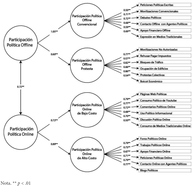 En segundo lugar, los resultados de este estudio contribuyen al conocimiento sobre la dimensionalidad de las formas online y offline de participación política. Con respecto a la participación offline, el AFC efectuado muestra que una estructura bifactorial logra un mejor ajuste a los datos que un modelo unidimensional. Esto permite verificar que, en primera instancia, los comportamientos políticos offline tienden a agruparse empíricamente de acuerdo a la distinción conceptual clásica efectuada entre activismo convencional y protesta política. Es así que los individuos se involucran de manera distinta con cada uno de estos modos de acción política. En otras palabras, una persona que participa frecuentemente en una actividad convencional (p. ej., asistir a debates políticos) no necesariamente se involucrará de la misma manera en una acción de protesta (p. ej., marchas o movilizaciones no autorizadas), teniendo mayor predisposición a adoptar activamente otros comportamientos de tipo convencional (p. ej., firmar peticiones políticas o contactar con funcionarios públicos).