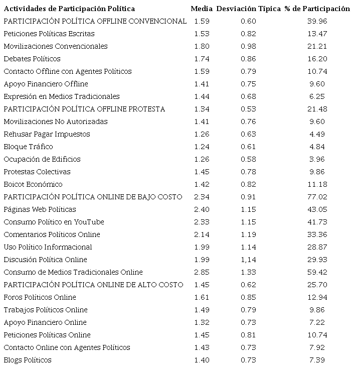 Participación Política Offline Protesta: Para su medición se utilizó una escala compuesta por seis ítems relacionados con actividades políticas de tipo protesta que pueden llevarse a cabo fuera de la Internet. Las actividades contempladas fueron: participar en huelgas o manifestaciones no autorizadas (Movilizaciones No Autorizadas); rehusar pagar impuestos (Rehusar Pagar Impuestos); bloquear el tráfico (Bloqueo Tráfico); participar en ocupación de edificios públicos (Ocupación de Edificios); tomar parte en protestas colectivas (Protestas Colectivas), y boicotear o deliberadamente comprar ciertos productos por razones éticas, ambientales o económicas (Boicot Económico). El nivel de implicación de los participantes en cada una de estas actividades se midió a partir de una escala de valoración de 5 puntos que va desde 1 (Nunca lo he hecho y nunca lo haría bajo ninguna circunstancia) hasta 5 (Lo he hecho muchas veces). La construcción de esta escala se basó en los aportes de DiGrazia (2014), Oñate (2005), Stolle, Hooghe y Micheletti (2005) y Somuano Ventura (2005).
