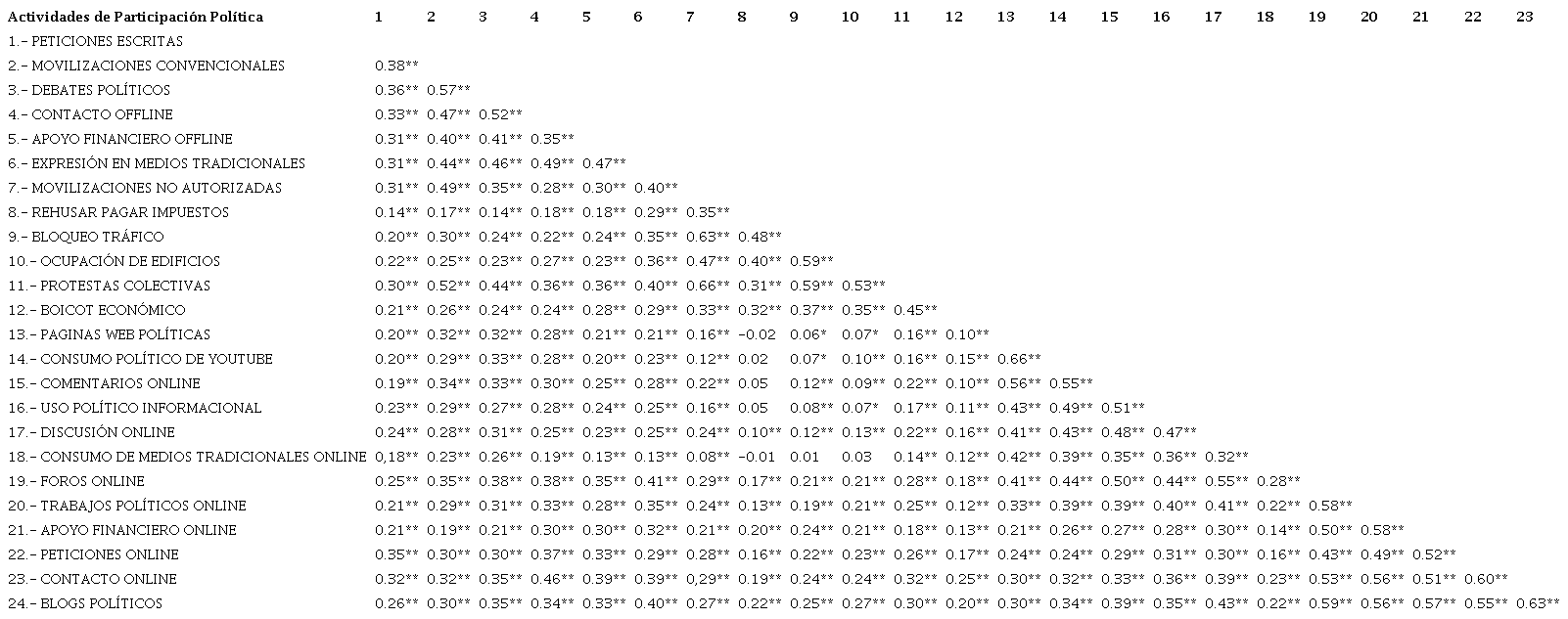Mientras tanto, la Tabla 2 contiene las correlaciones entre las actividades y conductas del repertorio de participación política examinado. Los resultados muestran que todas las actividades se encuentran intercorrelacionadas. No obstante, es posible identificar que las correlaciones tienden a reforzarse cuando se trata de actividades del mismo tipo: tal es el caso de las actividades de tipo offline protesta u offline convencional. Por el contrario, las correlaciones tienden a debilitarse cuando se evalúan actividades que pertenecen a tipos distintos de participación política, como las conductas políticas online de bajo costo en relación con aquellas de alto costo. Estos patrones de asociación resultan compatibles con las hipótesis de investigación planteadas, pues partiendo de la diferencia entre activismo político online y offline, se propone la presencia de subtipos al interior de cada una de estas dimensiones generales.
