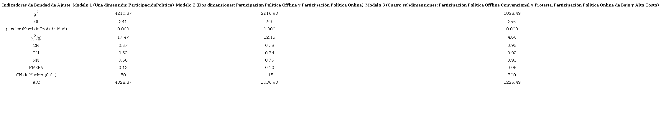 Con el propósito de verificar tales distinciones, se procedió a emplear la técnica de Análisis Factorial Confirmatorio (AFC) para la comparación de modelos con diferentes estructuras dimensionales. Complementariamente, se examina la confiabilidad de cada subescala de participación política mediante el uso del coeficiente Alfa de Cronbach.