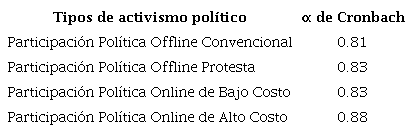 Con el fin de complementar los resultados del AFC, se procedió a evaluar el nivel de confiabilidad de las agrupaciones de ítems correspondientes a cada subdimensión de activismo político detectada. Para ello, se calculó el coeficiente Alfa de Cronbach (α). Los resultados de este análisis se muestran en la Tabla 4, en la cual en todas las subescalas se alcanzan valores sobre 0.80, que indica un grado de consistencia interna satisfactorio (Celina y Campo, 2005). Esto significa que cada actividad política posee una elevada intercorrelación con el resto de acciones: por ejemplo, el nivel de involucramiento en movilizaciones pacíficas y legales se asocia fuertemente con el resto de actividades políticas offline de tipo convencional.