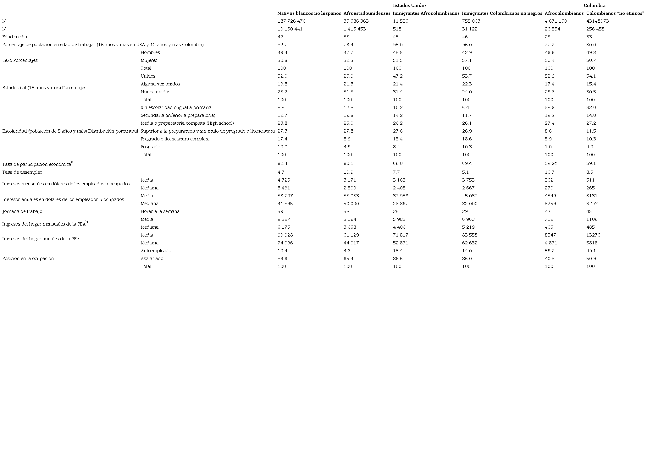 En este apartado analizamos algunas características de las poblaciones estudiadas para tener elementos que permitan entender las diferencias entre ellas en el mercado de trabajo. En el Cuadro 1 presentamos características seleccionadas de afrocolombianos y “no étnicos”, nativos blancos no hispanos, afroestadounidenses e inmigrantes afrocolombianos y no negros en Estados Unidos y Colombia. Se puede observar que las poblaciones más jóvenes las conforman los afrocolombianos que habitan en Colombia y la población “no étnica”, con edades medias de 29 y 33 años, respectivamente. El rango etario de los colombianos en Estados Unidos muestra claramente una selección de la población, posiblemente asociada al carácter principalmente laboral de la migración colombiana hacia este país: 96 % de los inmigrantes colombianos no negros y 95 % de los afrocolombianos se encuentran en edad de trabajar (16 años y más). Los afroestadounidenses constituyen la población más joven entre los grupos observados. En todos los casos, los porcentajes de mujeres son superiores a los de los hombres, pero las diferencias más notorias se ubican entre los inmigrantes colombianos no negros, de los cuales 57.1 % son mujeres. Al observar el estado conyugal de las poblaciones se constata que, en la mayoría de los casos, las personas se encuentran en la condición de unidos, siendo los colombianos “no étnicos” los que presentan el mayor porcentaje (54.1 %), seguidos de los inmigrantes colombianos no negros (53.7 %), los afrocolombianos (52.9 %) y los nativos blancos no hispanos (52.0 %); solamente 26.9 % de los afroestadounidenses se encuentran en esta condición y 51.8 % de la población es soltera o nunca unida.