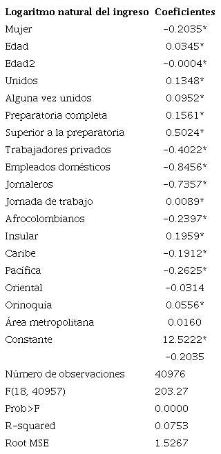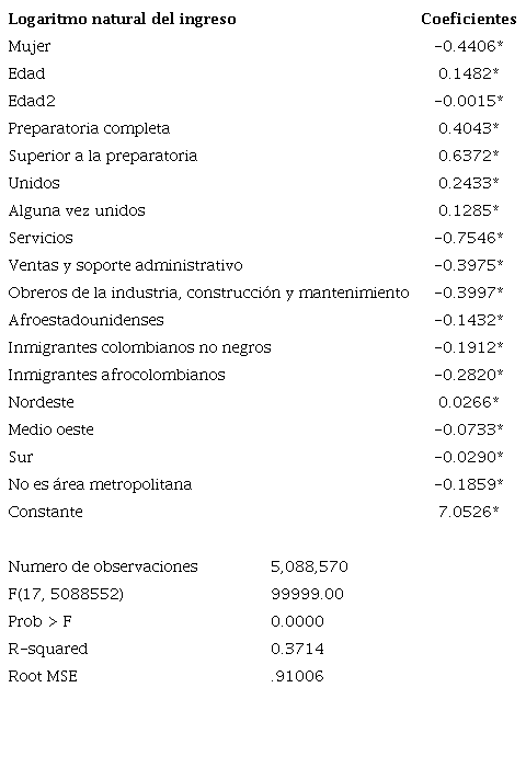 En el MCO4 empleamos como variable dependiente el logaritmo natural del salario -mensual en el caso colombiano y anual en el caso estadounidense- y como variables explicativas la edad y edad al cuadrado (edad²); el sexo con las categorías hombre y mujer; el estado civil con las categorías unido -casado o en unión libre-, alguna vez unido -separado, divorciado, viudo- y nunca unido; la escolaridad con las categorías sin escolaridad e inferior a la preparatoria, preparatoria completa y superior a la preparatoria; el tipo de trabajador -en el caso colombiano- con cuatro categorías: empleados públicos, empleados privados, empleados domésticos y jornaleros /la ocupación -en el caso estadounidense- con las categorías: ejecutivos y profesionales, ocupaciones en servicios (de baja calificación), ventas y soporte administrativo, obreros de la industria de fabricación, construcción y mantenimiento y ocupaciones en agricultura, y forestación y pesca; la adscripción étnica -en el caso colombiano- con dos categorías: no étnicos y afrocolombianos5/la raza -en el caso estadounidense- con cuatro categorías: nativos blancos no hispanos, afroestadounidenses, inmigrantes afrocolombianos y no negros; la jornada de trabajo -sólo en Colombia-; la región geográfica en el caso colombiano con las categorías: Andina, Caribe, Insular, Pacífica, Oriental y Orinoquía y en el estadounidense: Oeste, Nordeste, Medio oeste y Sur, y, por último, el área metropolitana de residencia con dos categorías: no vive en un área metropolitana y vive en un área metropolitana. Las diferencias en las variables incluidas en los dos modelos obedecen a limitaciones impuestas por las fuentes de datos.6 Es importante señalar que, pese a la reconocida importancia de variables como la “experiencia laboral”, la “ciudadanía” y “el tiempo de permanencia en Estados Unidos” -en el caso específico de los inmigrantes- en la determinación de los salarios, no se incluyeron en el análisis debido a limitaciones impuestas por la base de datos -American Community Survey- y por la intención de ajustar modelos lo más similares posible. En otras palabras, buscamos que en cada modelo se controlen variables similares.7