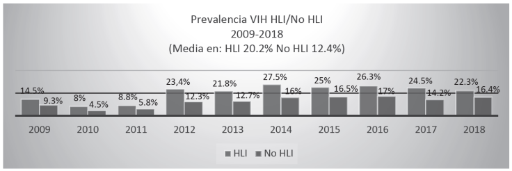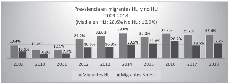 Por otra parte, en la Gráfica 2 observamos los porcentajes de migrantes VIH positivos, tanto internos (dentro de la República mexicana) como externos (en Estados Unidos) HLI y no HLI. Se puede observar una media de prevalencia a diez años mucho mayor en las personas que son HLI respecto a quienes no lo son. La prueba de chi-cuadrada demuestra que en los migrantes existe una dependencia significativa entre las variables hablante de lengua indígena y reactivo a la prueba del VIH.