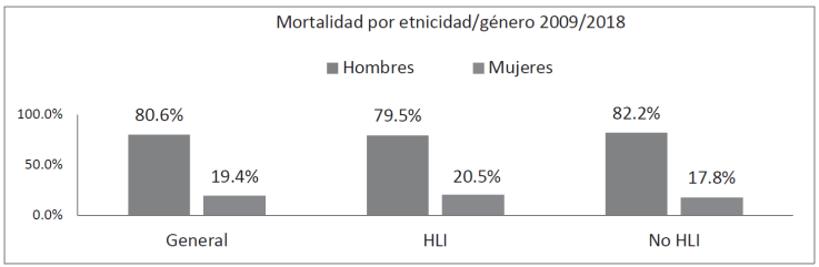 Cabe señalar que no existen razones específicas para que las personas HLI con VIH tengan más facilidades que las no HLI para acudir al CAPASITS a realizarse la prueba de detección. La base de datos para la mortalidad corresponde al registro oficial existente en el programa de VIH de Oaxaca. Se desagregó por etnicidad y por etnicidad y género y se compararon los porcentajes de mortalidad entre población HLI y no HLI. El indicador para la etnicidad fue ser hablante de lengua indígena, debido a que la autoadscripción étnica, que debería ser el criterio utilizado en las bases de datos, no se registra y hablar o no una lengua indígena nos permite contrastar críticamente los datos oficiales y producir datos propios.