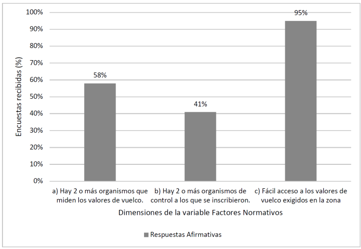 El Gráfico 1 presenta la variable denominada Factores Normativos en sus diferentes dimensiones (a, b y c), pudiendo visualizarse el porcentaje de respuestas afirmativas obtenidas en cada una de ellas. Para a y b se ha considerado como un exceso -problemático- el que las PTE estén vinculadas a dos o más organismos, porque su superposición interfiere con el correcto acatamiento a las normas establecidas y con la efectiva exigencia de su cumplimiento (Hanela et al., 2016), de modo que resulta llamativo, a la vez que alarmante, que alrededor de la mitad de los encuestados hayan respondido afirmativamente acerca de ambas dimensiones. En cuanto al tercer planteamiento (c), si bien la barra parece arrojar un dato alentador, en una segunda etapa de investigación habría que incursionar acerca de la legislación bajo la cual se opera (si es correcta o no) y acerca del efectivo cumplimiento de la misma.
