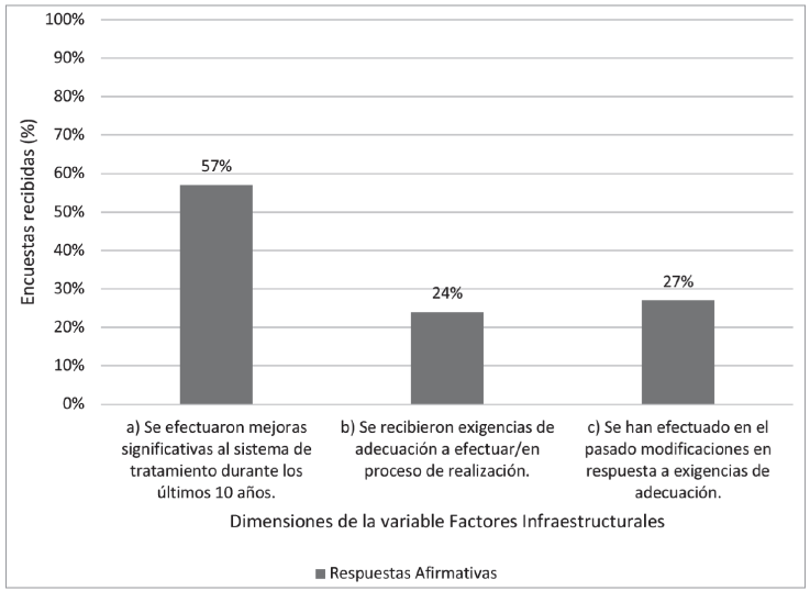 En el Gráfico 2 se presentan las dimensiones de la variable Factores Infraestructurales (a, b y c) y los porcentajes de respuestas afirmativas recibidas para cada una de ellas. Respecto a la dimensión a, si bien el porcentaje de encuestados con respuesta afirmativa supera -por poco- a la mitad del total, de todos modos, resulta llamativo que sea tan alto el porcentaje restante que no respondió afirmativamente, más aún teniendo en cuenta el vertiginoso avance de la ciencia y la tecnología en los últimos tiempos y su ineludible relevancia en materia de cuidado ambiental. En relación a la dimensión b, se entiende que haber recibido exigencias de adecuación de planta indica la existencia de falencias a nivel infraestructural que podrían llevar a un proceso de tratamiento deficiente e impactar en la calidad de los recursos hídricos receptores. Este dato podrá adquirir mayor fuerza en relación a la tercera dimensión (c), la cual arroja el porcentaje de PTE que sí han respondido a exigencias de adecuación realizadas con anterioridad. Al ser elevado el porcentaje de las PTE que no han respondido afirmativamente acerca de la realización de modificaciones según exigencias recibidas en el pasado (73 %), la proyección a futuro de la tendencia sugiere una “no adecuación” en términos de mayor sustentabilidad. Sin embargo, antes de confirmar semejante sentencia será necesario acceder a una segunda etapa de investigación. En dicha instancia será pertinente distinguir entre las PTE que no realizaron modificaciones porque no recibieron exigencias de adecuación -lo cual, de mantenerse la relación respecto al porcentaje de exigencias recibidas en la actualidad (b), indicaría un empeoramiento de las condiciones infraestructurales de las plantas- respecto a aquellas que no lo hicieron a pesar de haber recibido la exigencia.