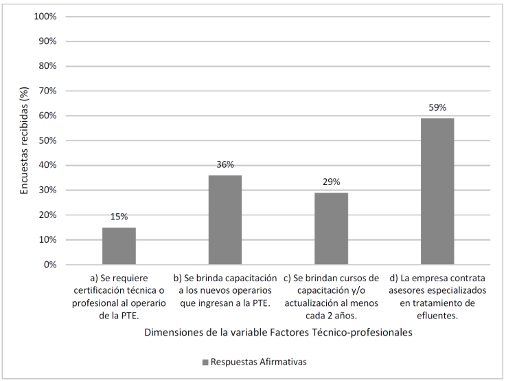 La variable denominada Factores Técnico-profesionales se presenta en el Gráfico 3 con sus respectivas dimensiones a, b, c y d, que reflejan los porcentajes de encuestados que respondieron afirmativamente para cada una de ellas. En función de las respuestas obtenidas se infiere que existe una escasa exigencia de saberes específicos a los operarios y un relegamiento del valor e importancia del dictado de capacitaciones específicas. En este sentido, sólo 15 % de los encuestados señaló que sí se exige un certificado o formación específica en relación a las tareas a realizar (dimensión a). Asimismo, las respuestas obtenidas para las dimensiones b y c traslucen que no existen planes de capacitación o de actualización dirigidos a los operarios de planta. En conjunto, la no exigencia de conocimientos específicos y la falta de capacitación en planta parecen dirigir a las empresas a optar por la contratación de profesionales externos (dimensión d, 59 %) al momento de verse interrumpida la rutina normal de funcionamiento ante la aparición de inconvenientes e imprevistos operacionales. Como resultado del análisis preliminar de esta variable en todas sus dimensiones, surge como una de las más inmediatas modificaciones a realizar el ajuste en la asiduidad y en las exigencias de capacitación que son efectivamente impartidas a la totalidad de los operarios de planta para lograr así promover la resolución inmediata y eficiente del conjunto de posibles eventualidades y mejorar la predisposición de la planta a la sustentabilidad.