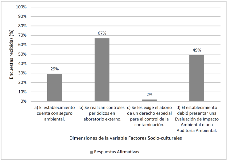 Respecto de la variable Factores Socio-culturales, ésta se distribuye en cuatro dimensiones (a, b, c y d) cuyos porcentajes de respuestas afirmativas obtenidas pueden visualizarse en el Gráfico 4 y cuya relevancia radica en que permite visibilizar cuestiones referidas estrictamente a la “permisividad” que en lo reglamentario caracteriza a la región (Ansaldi, 2008). Respecto a las dimensiones a y b, si bien entre ellas existe una notable diferencia, ambos son porcentajes llamativos si se considera que miden cuestiones atinentes directamente a la protección ambiental y que en ninguno de los dos casos los mismos se acercan a la totalidad. En relación a las dimensiones c y b, refieren a cuestiones íntimamente relacionadas al tipo y las características de PTE de que se trate -datos que fueron revelados en el apartado técnico de la encuesta, pero cuya exposición excede los propósitos del presente trabajo-, de modo que sólo adquieren relevancia vistos en relación a aquellos, lo cual en esta instancia no es posible.