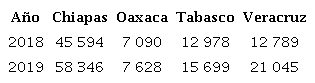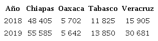 En semejanza con el PFS, en el caso del control de las caravanas a través del envío de la Guardia Nacional, hubo una dimensión territorial de contención migratoria en diferentes escalas. Unas de carácter local, como en los puntos y cruces fronterizos, otras a nivel municipal, como el caso de los municipios fronterizos antes mencionados y, finalmente, a nivel de entidad federativa -con Chiapas a la cabeza de dichas iniciativas- en un contexto general de la frontera sur del país. Esto produjo cambios drásticos en los registros de detenciones y deportaciones en los años 2018 y particularmente en el 2019, especialmente en lo referente a entidades del sur de México (ver cuadros 2, 3 y 4). Este tipo de medidas, no sólo no disminuyeron la violencia hacia migrantes, sino que además incrementaron la "criminalización" de los migrantes por parte del Estado y la ejecución de delitos contra ellos, por parte del crimen organizado, grupos de particulares y ciertas fuerzas de seguridad del Estado (REDODEM, 2020; MODH, 2020).