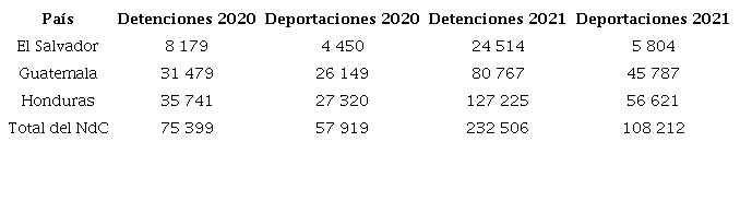 La situación de los migrantes originarios del NdC a raíz de la Covid-19, no mejoró (REDODEM, 2022, 2020b). En México pero también a nivel regional de Norteamérica y Centroamérica se dieron procesos de cierre y securitización de fronteras, con el argumento de la emergencia sanitaria. Particularmente el gobierno de EE. UU. tuvo un uso político de la pandemia para promover y difundir su agenda anti inmigrante y de contención de movilidades humanas forzadas, irregulares y transfronterizas; no sólo en el marco de su territorio nacional, sino también de México y Centroamérica. En el área mexicana se vieron dinámicas de desocupación de estaciones migratorias y deportaciones súbitas (como también acontecieron en EE. UU.) durante el primer año de la Covid-19 (MODH, 2020). En este contexto, la violencia y "criminalización" hacia los migrantes (de parte del Estado) y de la comisión de delitos contra ellos (realizada por el crimen organizado, particulares, Estado) sigue presente (MODH, 2020; REDODEM, 2022, 2020d, 2020c). De igual manera, tanto el cierre de fronteras (en Centroamérica, México y EE. UU.), así como el contexto del SARS-COV2 , produjeron durante 2020 una disminución en el volumen demográfico de los flujos migratorios. No obstante, en 2021 hubo un drástico y exponencial crecimiento de las migraciones irregularizadas del NdC.