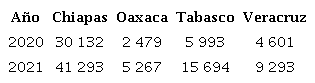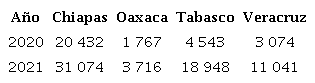 Ahora bien, las cifras de migrantes del NdC del grupo de las entidades federativas del sur (Chiapas, Oaxaca, Tabasco y Veracruz) durante el primer año de la Covid-19 fue de 43 205 detenciones (lo que implicó 57.3 % del acumulado nacional total), y de 29 816 deportaciones (que representó 51.4 % del total nacional) (ver cuadros 5, 6 y 7) (UPM, 2020). Posteriormente, en el segundo año de la emergencia sanitaria, hubo un incremento sustantivo de las migraciones del NdC, y también de las detenciones y deportaciones. Los registros fueron de 71 574 detenciones (lo que representó 30.7 % del conjunto completo del acumulado nacional), y 64 779 deportaciones (que fue 59.8 % del total nacional) (ver cuadros 5, 6 y 7) (UPM, 2022). De esto modo, el sur del país fue para estos años el gran concentrador de detenciones y deportaciones, y fue una región primordial en las acciones y medidas de control y contención migratorias estatales.