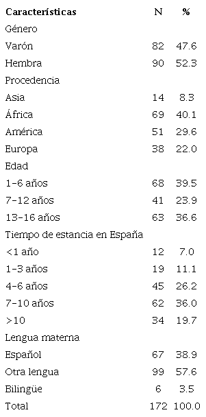 La selección de los participantes se realizó mediante un muestreo incidental en 24 centros educativos públicos de Andalucía con un alto porcentaje de estudiantes de origen inmigrante y dispuestos a colaborar en el estudio. La muestra estuvo constituida por 172 estudiantes de origen inmigrante que, habiendo llegado a España en edad escolar, habían sido escolarizados en el sistema educativo, en la cual 52.3 % eran mujeres y 47.6 % varones. El rango de edad se planteó entre 6 y 16 años (M = 12.6, DT =.79). La media del tiempo de estancia en España era de 6 años en promedio (DT =3. 4) y valores máximos de 16 años y mínimos de 1 año. Por otro lado, la lengua de origen, extremadamente variada, se distribuyó de la siguiente manera: español (38.9 %), otras lenguas (57.6 %) y bilingües (3.5 %), con una variedad de doce lenguas diferentes. En cuanto a la procedencia geográfica nos encontramos una gran variabilidad de países (25 países diferentes), los más numerosos fueron Marruecos (31.5 %) y Rumanía (15 %), lo que no se diferencia mucho de la representación de países de la nacionalidad de este tipo de estudiantes en España. La distribución de dicha muestra, de acuerdo con las categorías de las variables más significativas, es la que aparece en la Tabla 1.