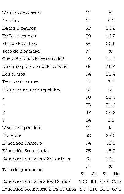 En general, las trayectorias escolares de estos sujetos no se corresponden con la esperada de manera tradicional, e interpretadas desde lo que se considera "éxito escolar": un solo centro educativo o a lo sumo dos para toda la trayectoria escolar, escolarización en el curso que le corresponde por edad y no incidencias o mínimas incidencias de tasa de repetición y una tasa de graduación en cada etapa (Primaria y Secundaria) de acuerdo con la edad estipulada.