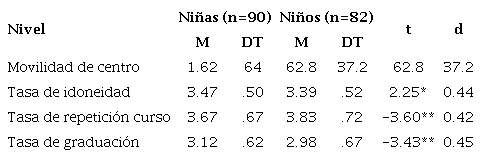En la Tabla 3 se muestra el análisis comparativo de la trayectoria del alumnado de acuerdo con cada una de las variables de análisis en función del género. Los resultados muestran que las estudiantes tienen trayectorias escolares más lineales, alcanzando puntuaciones más altas en tasa de idoneidad y tasa de graduación. Por el contrario, los estudiantes muestran puntuaciones más altas en repetición de curso. No se encontraron diferencias en movilidad de centro. Ahora bien, el estadístico d de Cohen indica que el tamaño del efecto es reducido, ya que presenta un valor de 0.40, excepto por la tasa de graduación que es moderado (0.45).