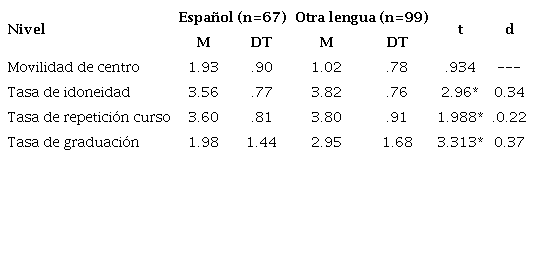 Por su parte, se utilizaron las pruebas t para examinar las diferencias de subgrupos según el género, la procedencia, el tiempo de estancia en España o la lengua materna. Es importante señalar que aparecieron diferencias significativas en las trayectorias escolares en función del género y la lengua materna pero no en función de la procedencia y el tiempo de estancia en España.