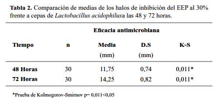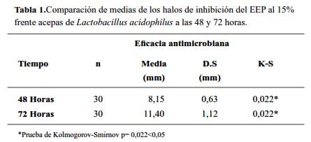 Los halos de inhibición de los extractos etanólicos de propóleo al 15% y 30% sobre las cepas de Lactobaci- llus acidophilus no presentaron distribución normal; mientras tanto el gluconato de clorhexidina al 0,12% presentó distribución normal, mediante la prueba de Kolmogórov-Smirnov. El extracto etanólico de pro póleo (EEP) al 15% presentó una media de 8,15mm, con una desviación estándar (D.S) 0,63 mm a las 48 horas y una media de 11,40mm, con una D.S de 1,12 mm a las 72 horas, encontrándose una diferencia significativa de p<0,022 para ambas muestras (tabla 1).