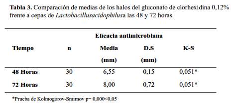 El gluconato de clorhexidina al 0,12% presentó una media de 6,55 mm, con una desviación estándar (D.S) de 0,15 mm a las 48 horas y una media de 8,00 mm, con una D.S de 0,72 mm a las 72 horas. Encontrándose una diferencia significativa de p<0,051 para ambas muestras (tabla 3).