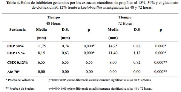 En conclusión, la investigación encontró que el extracto etanólico de propóleo al 30% obtuvo mayor efecto inhibitorio in vitro frente a la cepa de Lacto- bacillus acidophilus al cabo de 48 y 72 horas cuando se le comparó con el gluconato de clorhexidina al 0,12%.