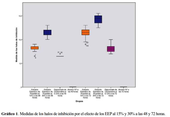 Eguizábal et al., realizaron un estudio en el que se usó concentraciones menores demostrando su actividad antimicrobiana del EEP al 0,8%, 20% y 30% en comparación a la clorhexidina al 0,12% frente a cepas de Streptococcus mutans yLactobacillus casei en una muestra de 10 placas para cada cepa, demostrando que a partir de una concentración de 0,8% de EEP ejerce actividad antibacteriana (19). Cayo et al., realizaron un estudio in vitro donde se evaluó el efecto antibacteriano del propóleo frente a cepas de Streptococcus mutans, determinando que a partir de una concentración al 10% de propóleo ejerce acción antibacteriana (26). Sin embargo el estudio de Akca et al., revelaron que el EEP podría ser tan eficaz como la clorhexidina en Bacterias cariogénicas, aunque el efecto bactericida de EEP fue mejor que el de la clorhexidina en L. acidophilus, L. salivarius subsp. salivarius y P. intermedia (31). Estos resultados acerca del EEP en menores concentraciones difieren con nuestro estudio in vitro donde se observó que el EEP al 30% presentó mayor efecto inhibitorio.