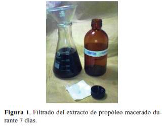 El presente estudio fue de tipo experimental in vitro, mediante el método de difusión en disco placa, llamada también el método de Kirby-Bauer. Seleccionándose la bacteria asociada a la caries dental Lactobacillus acidophilusde uso comercial, presentación en ampolla y cuya procedencia fue del laboratorio LMB.H COLICHON®. Llevándose a cabo en el la- boratorio de microbiología de la Universidad Privada Norbert Wiener, durante el año 2016. El propóleo fue obtenido bajo el control de calidad de un Químico Farmacéutico - UNMSM, durante el mes marzo del 2016, certificado por Hierbamiel Perú S.A.C. y de procedencia del valle de Oxapampa-Pasco, ubicado a 1814 msnm, luego, el propóleo en estado natural, fue trozado en pedazos pequeños y enseguida se deposi- tó en un envase de vidrio ámbar conteniendo alcohol de 70°, de tal manera que el solvente cubriera todo los fragmentos del propóleo; se dejó en maceración a temperatura ambiente, protegido de toda fuente de luz y con agitación diaria durante una semana, enseguida se filtró (figura 1), luego, se llevó a estufa a 50°C, para evaporación del alcohol 70° y así obtener extractos concentrados de propóleo (figura 2).