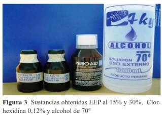 Las sustancias experimentales obtenidas fueron el extracto etanólico de propóleo al 15% y 30%. Para los controles fueron utilizados el gluconato de clorhexidina al 0,12% como control positivo y alcohol etanólico 70° como control negativo (figura 3).