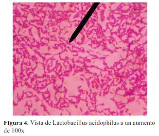 La activación de la cepa fue realizada tomando una pequeña cantidad de la misma, contenida en la am- polla, con ayuda de una micropipeta hacia un tubo de ensayo que almacenaba caldo tioglicolato de sodio. Luego se colocó dentro de una jarra de anaerobiosis conjuntamente con un sobre generador de CO . Incubándola a 37°C en la estufa por 48 horas. Poste- riormente para su replicación se realizó un sembrado en una placa petri con agar base sangre y se llevó a la estufa por 48 horas en las mismas condiciones de anaerobiosis. Luego se procedió a la observación del Lactobacillus acidophilus a través de un microscopio óptico a un aumento de 100X (figura 4), después se tomó 4 colonias aisladas de la bacteria con un asa de siembra y se transfirió a un tubo de ensayo con 5ml de caldo de tripticasa de soya, controlando la turbidez del inóculo, hasta obtener la misma que la escala de Mc Farland 0,5. Para su posterior sembrado en las placas.