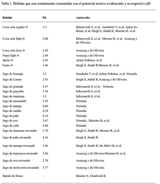 El efecto erosivo de una bebida no sólo depende de su potencial, sino de las características inherentes del paciente: capacidad buffer y rango flujo salival, al igual que la formación de la película adquirida (10) En la tabla 1 mostramos evidencia científica del potencial erosivo de las bebidas descritas.