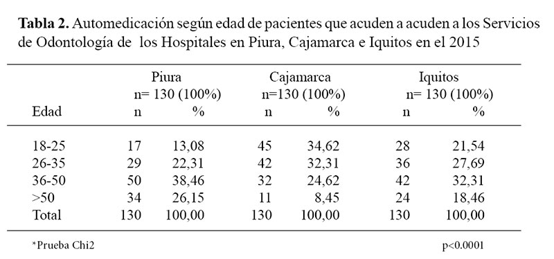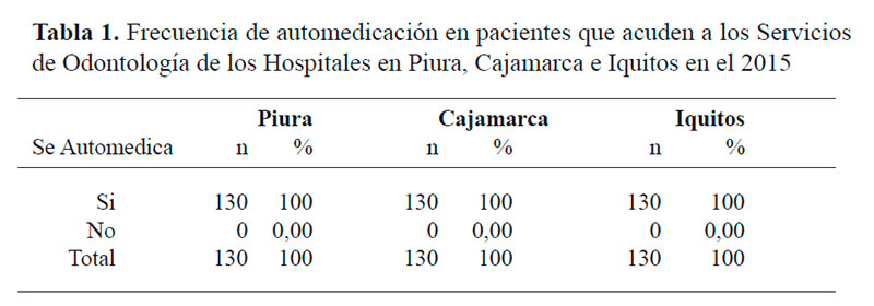 Los resultados obtenidos muestran que el 100% (n=390) de los encuestados tanto en Piura (n=130) como en Cajamarca (n=130) e Iquitos (n=130) se automedicaban (tabla 1).