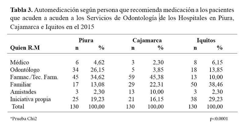 Todas los pacientes encuestados en el presente estudio se automedican. Los pacientes de Piura e Iquitos entre las edades 36 y 50 años de edad fueron las que más se automedicaron y en Cajamarca entre 18 y 25 años de edad. De los cuales fueron en mayoría mujeres amas de casa que estudiaron hasta el nivel secundario. El farmacéutico es quien más recomienda el medicamento e influye en la automedicación. El dolor dental fue el tipo de dolencia por el cual las personas se automedicaban. El hábito fue el motivo por el cual las personas se automedicaban. La televisión fue el medio de comunicación más utilizado para promover que las personas se automediquen. La mayoría de los pacientes en los tres hospitales de Piura, Cajamarca e Iquitos se automedicó por 2 días. El lugar más concurrido por los pacientes para la adquisición de los medicamentos fue la farmacia. El medicamento más consumido por los pacientes de los hospitales de Piura y Cajamarca fue el analgésico y en el hospital de Iquitos AINEs.