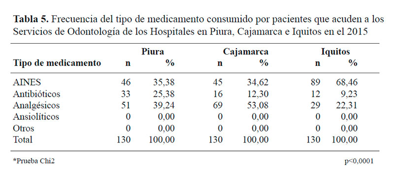 Respecto al tipo de dolencia por el cual los pacientes se automedican con mayor frecuencia, fue el dolor dental en los tres hospitales; en Piura 53,85% (n=70), Cajamarca 68,46% (n=89) e Iquitos 65,38% (n=85), seguido por la inflamación con 46,15% (n=60), 16,15% (n=21), 27,69% (n=36) respectivamente (tabla 4).