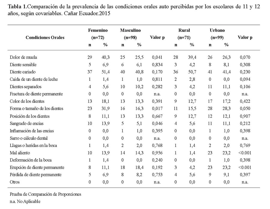 Las condiciones orales auto percibidas como problemas más frecuentes encontradas fueron: en el sexo femenino, diente cariado (51,4%), dolor de muela (40.3%) y en el sexo masculino, diente cariado (40,8 %) y dolor de muela (25,5%); en la zona urbana, diente cariado (41,4%), forma o tamaño de los dientes (28,3%) y en la zona rural, diente cariado (50,7%) y dolor de muela (39,4%) (tabla 1).