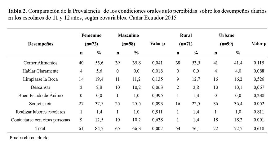 Los desempeños que más frecuentemente afectan la calidad de vida de los niños de 11 y 12 años del cantón Cañar según sexo, fueron: para el sexo femenino comer y sonreír (55,6% y 37,5% ) respectivamente; y para el sexo masculino comer (39,8%) y sonreír (25,5%).Según lugar de procedencia, son: para la zona urbana, comer (41,4%) y sonreír (36,4%);y para la zona rural, comer (53,5%) y sonreír (22,5%). El 72,7% de los niños de la zona urbana y el 76,1% de los de la zona rural tienen algún desempeño que afecta la calidad de vida relacionada a la salud oral (tabla 2).