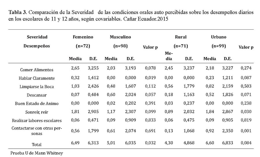 La severidad del impacto de las condiciones orales auto percibidas sobre los desempeños diarios que afectan la calidad de vida obtuvo su promedio más alto en comer alimentos 2,65±3,25, y el valor más bajo el estudiar 0,06±0,47, para el sexo femenino y para el sexo masculino, el promedio más alto estuvo en comer alimentos 2,03±3,19 y el valor más bajo fue estado de ánimo 0,02±0,20. Según zona el promedio más alto en comer alimentos 2,18±3,22, y el valor más bajo estudiar 0,09±0,90, para la zona urbana; y para la zona rural, el promedio más alto estuvo en comer alimentos 2,45±3,23 y el valor más bajo fue estado de ánimo 0,03±0,23. Se encontró diferencias estadísticamente significativas en la actividad de Sonreír y socializar p=0,03 y p= 0,001 (tabla 3).