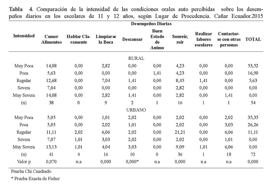 Los desempeños más afectados para la zona rural fueron comer y sonreír en un (53,5% y 22,5%), resultados que se asemejan a los de Ingunza29 que reporta de su investigación llevada a cabo en una zona marginal y de un nivel socioeconómico bajo (Pachacútec); que se asemeja al Cantón Cañar.