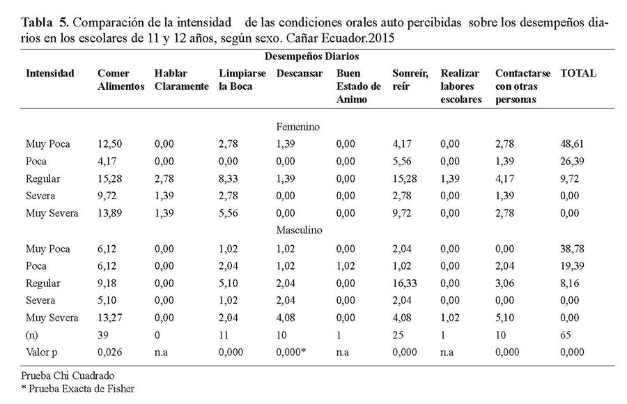 La intensidad del impacto de las condiciones orales auto percibidas sobre los desempeños en actividades diarias en escolares, se halló según lugar de procedencia, se encontró diferencia estadísticamente significativa en intensidad del impacto de las condiciones orales sobre los desempeños diarios de limpiarse la boca, descansar y sonreír para ambos grupos de escolares (tabla 4). Para las mujeres los niveles de intensidad de impactos entre “Muy poca” y “Poca Intensidad” en un (75%), para los varones se determinó que los impactos entre “Muy poca” a “Poca intensidad” se encuentra en el 58,17% de los escolares (tabla 5).
