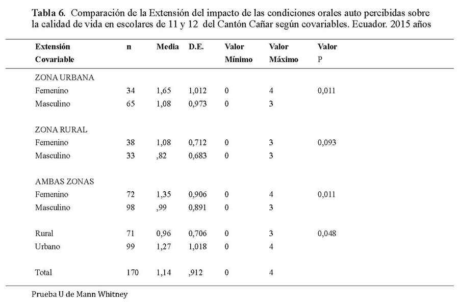 La extensión del impacto de las condiciones orales auto percibidas sobre la calidad de vida de los escolares de 11 y 12 años de edad del Cantón Cañar, tuvo diferencias estadísticamente significativas tanto según sexo como lugar de procedencia (p=0,01) y (p=0,048) respectivamente (tabla 6).