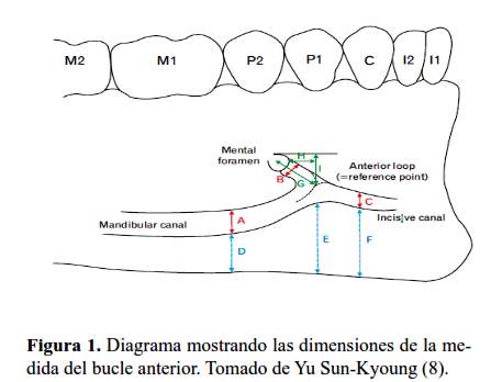 El conducto mandibular que contiene el NAI atraviesa el FM anteriormente (figura 1), su parte final del NAI pasa a veces por debajo del borde inferior y la pared anterior del agujero mentoniano y, después de dar una rama incisiva, en la región donde se divide en los conductos mentales e incisivos, se curva hacia atrás para entrar en el agujero y emerge a los tejidos blandos convirtiéndose en el NM. Esta característica anatómica también se conoce como “bucle anterior” del nervio alveolar inferior (8, 9).
