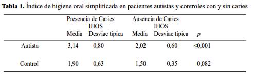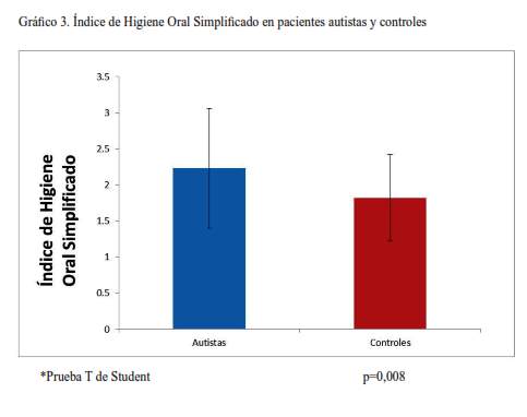 Rai et al., realizaron un estudio con 101 pacientes autistas y 50 controles en la India. Luego de determinar el índice de higiene oral, concluyó que el grupo control arrojó un valor de 1 y el grupo de niños autistas un valor de 1.2 (p<0.001) (14), lo cual demuestra al igual que en la presente investigación que los pacientes autistas acumulan más placa y cálculo.