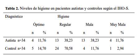 Según los niveles del IHO-S, la media de los pacientes autistas se corresponde con una higiene mala y los resultados de la población control entran dentro del rango de higiene regular. Así mismo, se muestra que en el grupo de pacientes autistas, 13 niños (38,23%) presentaron mala higiene y 13 higiene regular, los restantes 8 pacientes, se dividieron equitativamente entre buena y muy mala higiene. Por el contrario, en los pacientes controles 24 niños (70,58%) presentaban una higiene regular (tabla 2).