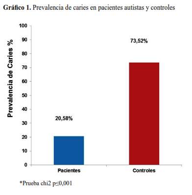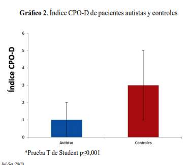 Contrario a los estudios anteriores, Jaber evaluó 61 niños autistas y 61 controles en Dubai, Emiratos Árabes Unidos, luego de determinar el índice de caries, concluyó que los pacientes autistas tenían significativamente más caries que los niños sanos, ya que el 77% del grupo de estudio presentó caries, contra el 46% de los pacientes sanos, lo cual arrojó significancia estadística (25). En el mismo orden de ideas, Bassoukou et al., reportaron un índice CPO-D de 2,00±2,83 en los pacientes autistas y 1,79 ± 3,07 en el grupo control (26).