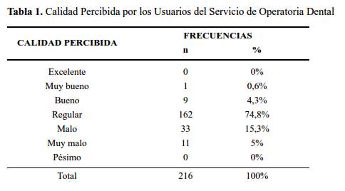 Por todo lo antes descrito, la medición de calidad de la atención se puede realizar desde varias perspectivas o dimensiones como son: la calidad técnica-científica (evaluada desde la posición profesional, evaluación por pares) y la calidad percibida por el usuario externo (paciente) considerando la calidad del entorno y calidad humana (trato), de modo tal que pueda cubrirse con las definiciones previamente descritas. Bajo este contexto, y en función al servicio que brinda la Clínica Odontológica Docente de la Facultad de Odontología de la Universidad Nacional Federico Villarreal (UNFV), se realizó la presente investigación con el objetivo de describir la calidad técnica de los tratamientos efectuados por los operadores y la calidad percibida por los usuarios externos (pacientes) del Servicio de Operatoria Dental de la Clínica Integral del Adulto de la Facultad de Odontología de una universidad estatal de Lima Metropolitana atendidos durante el año académico 2014.