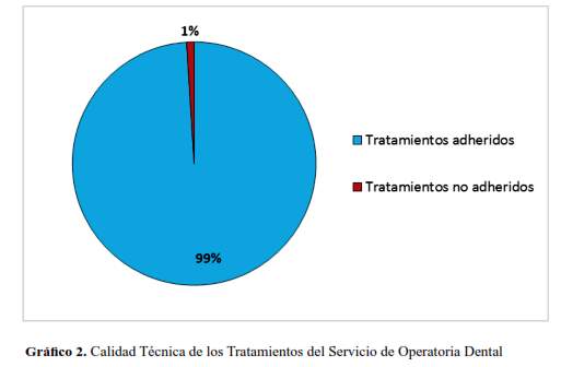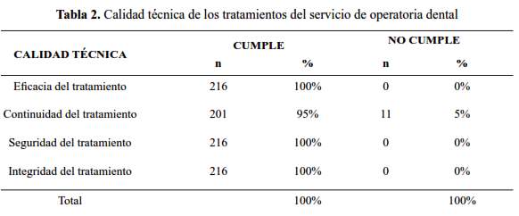 Contrariamente, al evaluar la calidad técnica, es decir aquella que tiene que ver con el procedimiento, exactitud del diagnóstico clínico, adherencia a los procedimientos y aplicación de los fundamentos científicos y tecnología clínica que permitan maximizar los beneficios para la salud sin incrementar los riesgos asistenciales, para lograr el máximo equilibrio de riesgo-beneficio, donde no interviene la percepción del paciente, orientada estrictamente a los aspectos técnicos-científicos (Calidad Técnica) de la atención que son medidos a través de criterios de eficacia, continuidad, seguridad e integridad del tratamiento; encontramos que, tan solo un aspecto, el de “Continuidad del tratamiento”, se cumple en el 95% de tratamientos evaluados; mientras que los otros aspectos como “Eficacia del tratamiento”, “Seguridad del tratamiento” e “Integridad del tratamiento” se cumplen en el 100% de los casos evaluados (tabla 2).