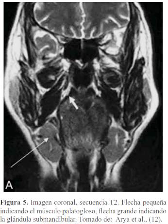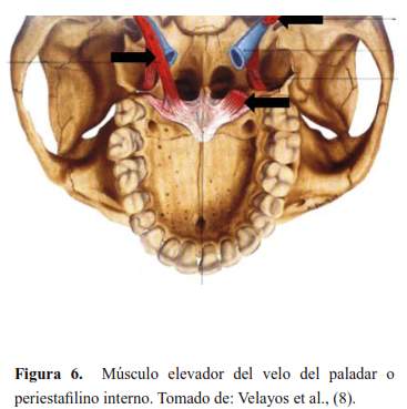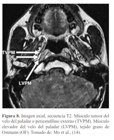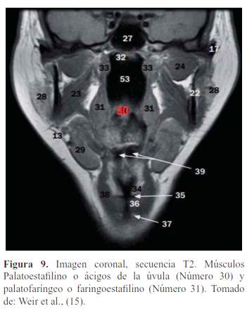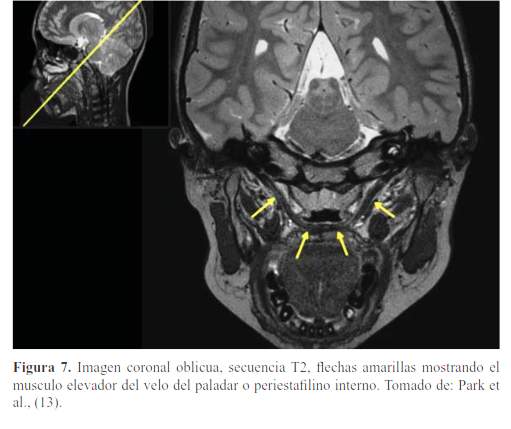 El paladar blando está formado por 5 músculos a cada lado, insertados en el velo, formados de adelante hacia atrás vistas mediante RM (10) (figura 5, figura 6, figura 7, figura 8 y figura 9):