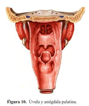 El paladar blando se continúa lateralmente con los pilares del velo del paladar y con el dorso de la lengua, con quienes forman el istmo de las fauces (figura 10 y figura 11). En el espesor del paladar blando se el músculo elevador del velo del paladar, que unido a la contracción del musculo constrictor superior de la faringe, hace que se separen las porciones nasal y oral de la faringe en el proceso de la deglución; al mismo tiempo la contracción del musculo palatofaringeo del pilar posterior colabora con el estrechamiento del istmo de las fauces. El velo del paladar contiene glándulas salivales mucosas y tejido linfático (8).