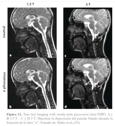 El conocimiento de las funciones de los músculos del paladar blando se puede realizar como hemos visto en tiempo real mediante secuencias rápidas de resonancia magnética. En el estudio de Sinko et al., estudiaron 65 imágenes por resonancia magnética en 1,5 y 3 teslas en secuencia de estado estacionario steady-state precession (trueFISP) de pacientes con historia de paladar hendido, evaluando las estructuras anatómicas en tres estados funcionales (reposo, fonación de la vocal “e” y fonación de la letra “k”). Observaron que la calidad de imagen fue mucho más alta en 1,5 tesla que, en 3 teslas, además demostraron que para una mejor evaluación de las estructuras del velo del paladar (en los tres estados funcionales) es mejor usar la imagen de 1,5 tesla (18).Adicionalmente, se podría pensar que la posición decúbito supino durante el examen por resonancia magnética pueda alterar las estructuras del velo del paladar, sin embargo, Perry JL demostró que la posición del cuerpo vertical tuvo un efecto mínimo sobre el espesor, longitud y altura del velo del paladar. Por lo que podemos deducir que la posición decúbito supino no altera o no ejerce un efecto desfavorable para el diagnóstico imagenológico (32).