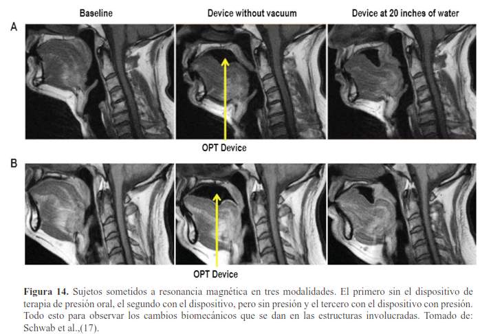 El tratamiento para el SAOS puede mejorar la hipertensión, disminuir el riesgo de infarto al miocardio, accidentes cerebro vasculares, entre otros, en la actualidad se realiza un nuevo tratamiento para este desorden, llamado terapia de presión oral que mediante un dispositivo aplican presión negativa en la boca y tiene como resultado el aumento del calibre de la vía aérea retropalatal, moviendo el paladar blando hacia adelante y arriba, desplazando además la porción antero superior de la lengua hacia adelante (figura 14) (17).