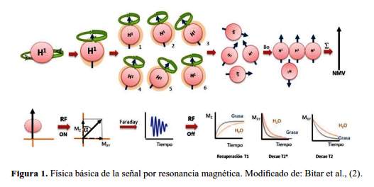 Los núcleos rotan alrededor de su mismo eje o spin, este movimiento induce a la formación de una fuerza magnética (figura 1). La molécula de hidrógeno inicialmente realiza un movimiento de precesión en varios ángulos, pero cuando están expuestos a una carga magnética externa, ellos se alinean. La suma de todos los momentos magnéticos es llamada Vector Neto de Magnetización (NMV). Cuando un pulso de radio frecuencia es aplicado (RF) el vector neto de magnetización es cambiado a un ángulo, que produce 2 componentes de magnetización: magnetización longitudinal (M Z ) y magnetización transversa (M XY) (2).